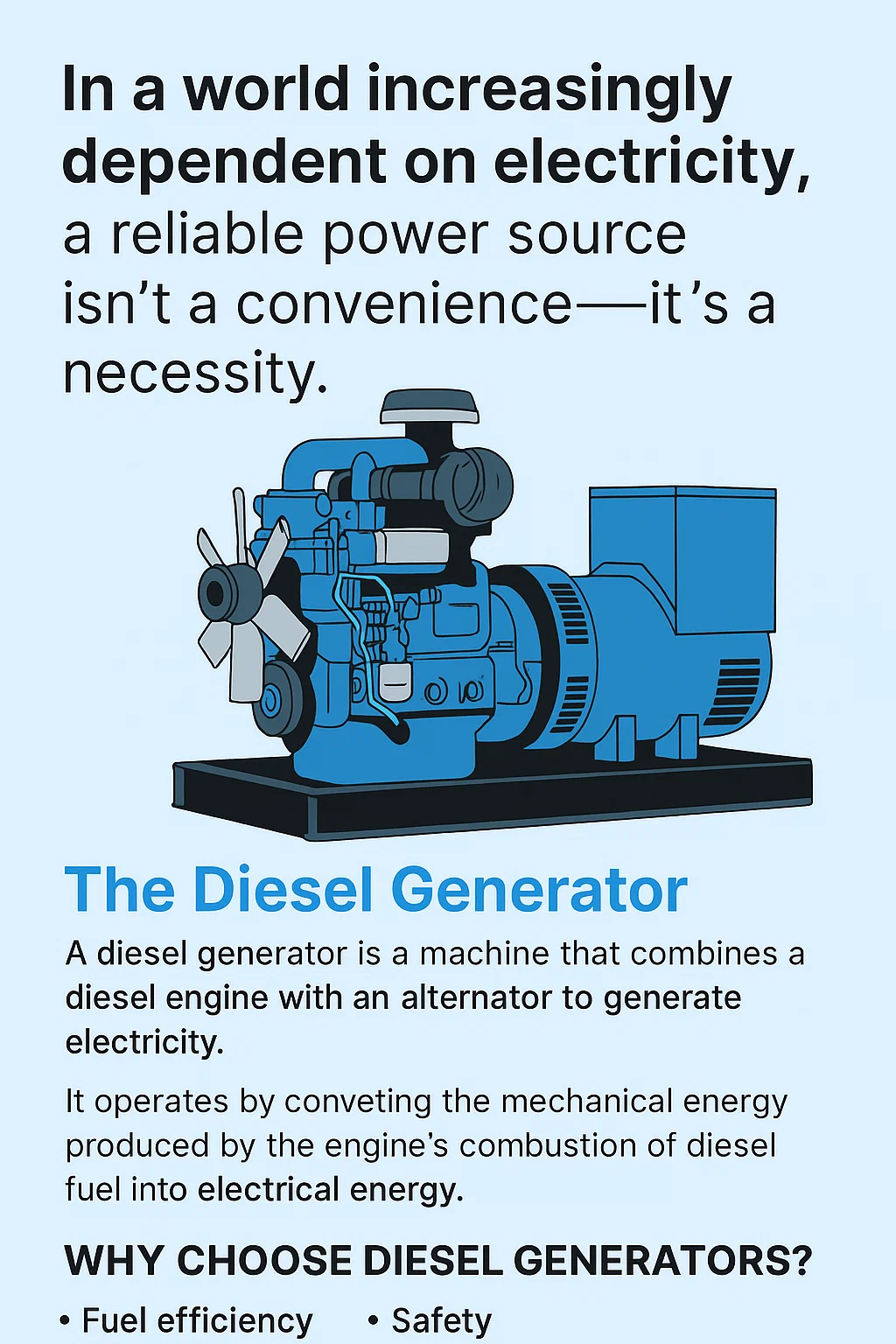 Keandalan dan keserbagunaan pembangkit diesels telah menjadikannya sangat diperlukan di berbagai industri dan untuk berbagai aplikasi penting. Kemampuan mereka untuk memberikan output yang tinggi dan konsisten kekuatan di lingkungan yang beragam menjadikannya solusi tepat untuk pencadangan dan kekuatan utama kebutuhan.